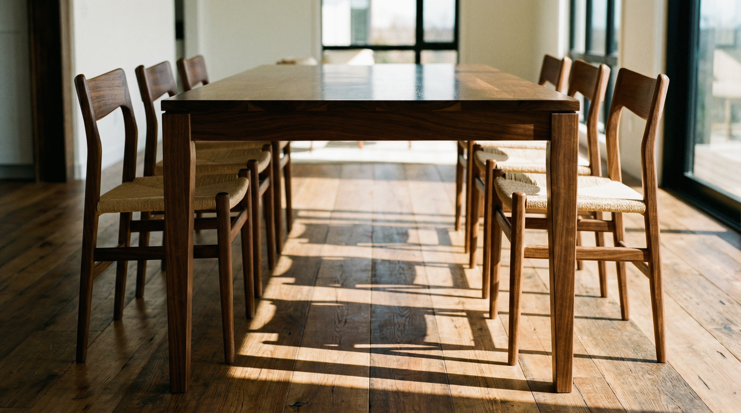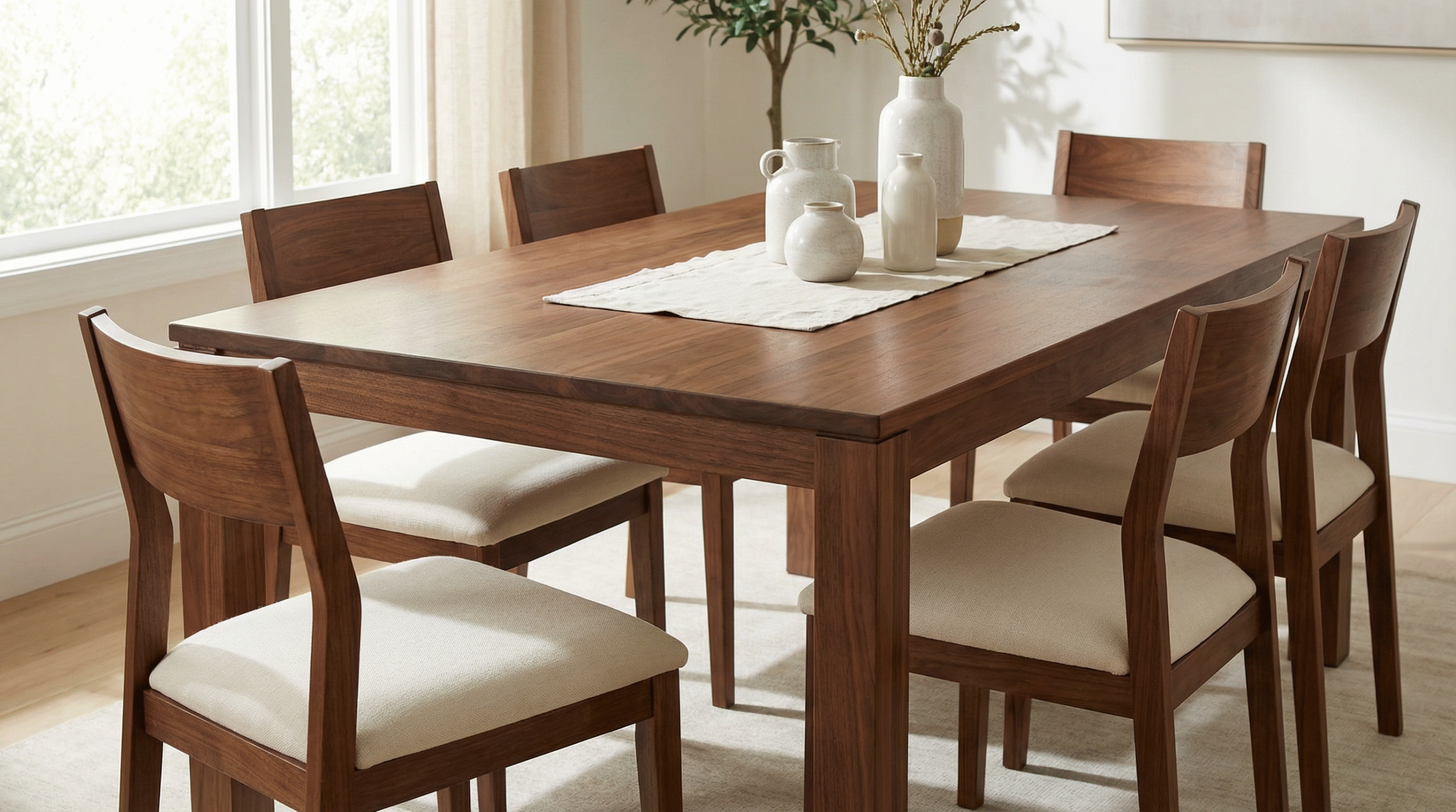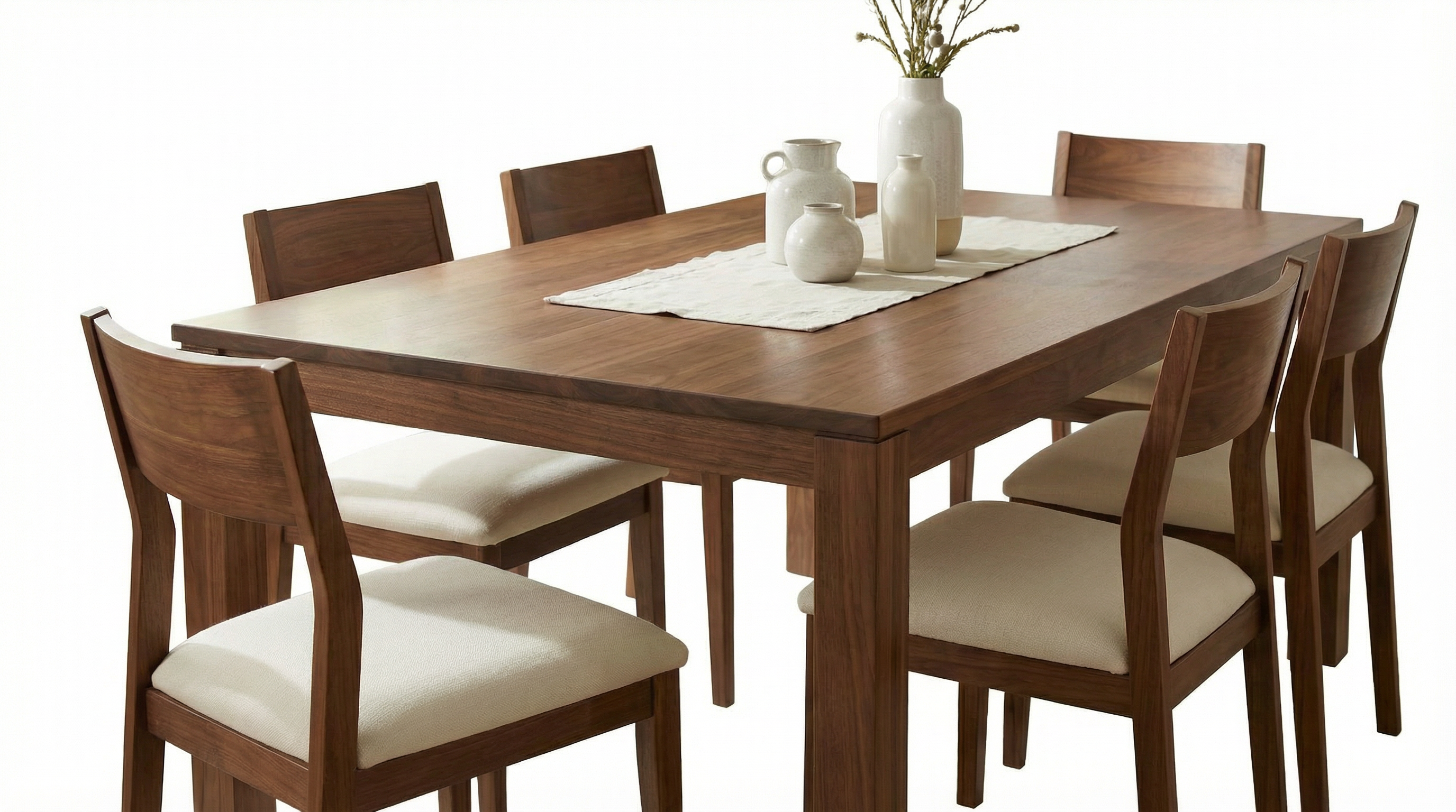 + Free ShippingA premium 6-seater walnut dining set featuring a minimalist Scandinavian design, cushioned chairs, and a durable wooden table—perfect for modern and elegant dining spaces.